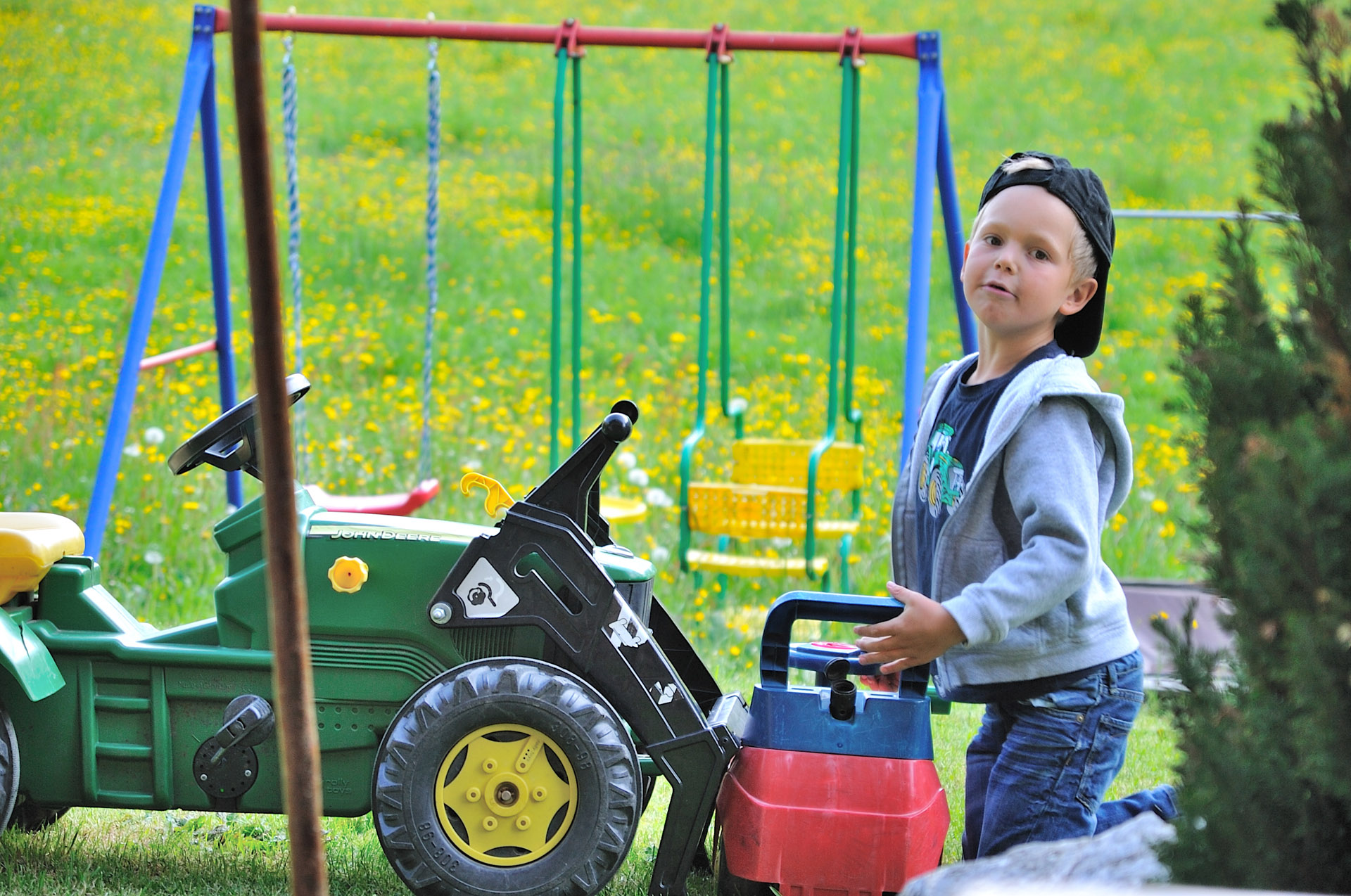 Wir haben viel Platz zum Spielen und Toben und sind bestens ausgestattet mit Trampolin, Sandkiste, Schaukeln und Kinderfahrzeugen.